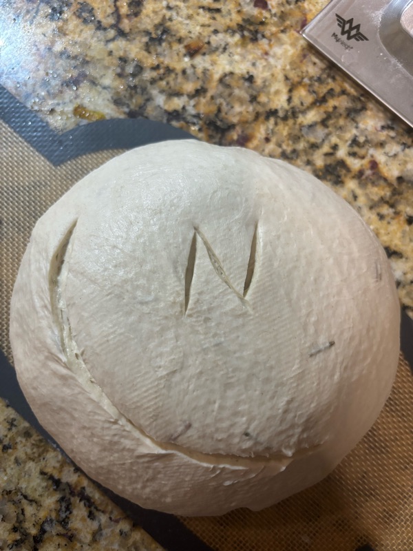 Basically, this is all a giant experiment of different flour, sticky dough, super long fermentation time, and moving the stages of the bread from one house to another twice! Because I promised my mother-in-law for her birthday.